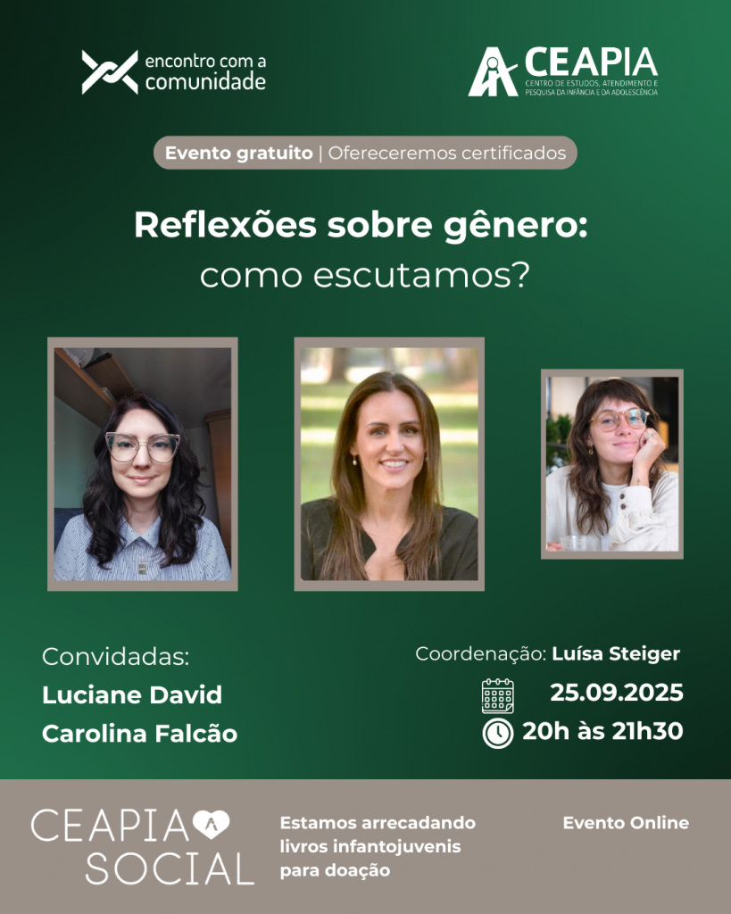 Encontro com a Comunidade | Reflexões sobre gênero: como escutamos? No dia 25 de setembro de 2025, das 20h às 21h30, o CEAPIA promove um encontro aberto ao público para refletir sobre os modos de escuta das questões de gênero na atualidade. O evento contará com a participação de Luciane Rombaldi David e Carolina de […]