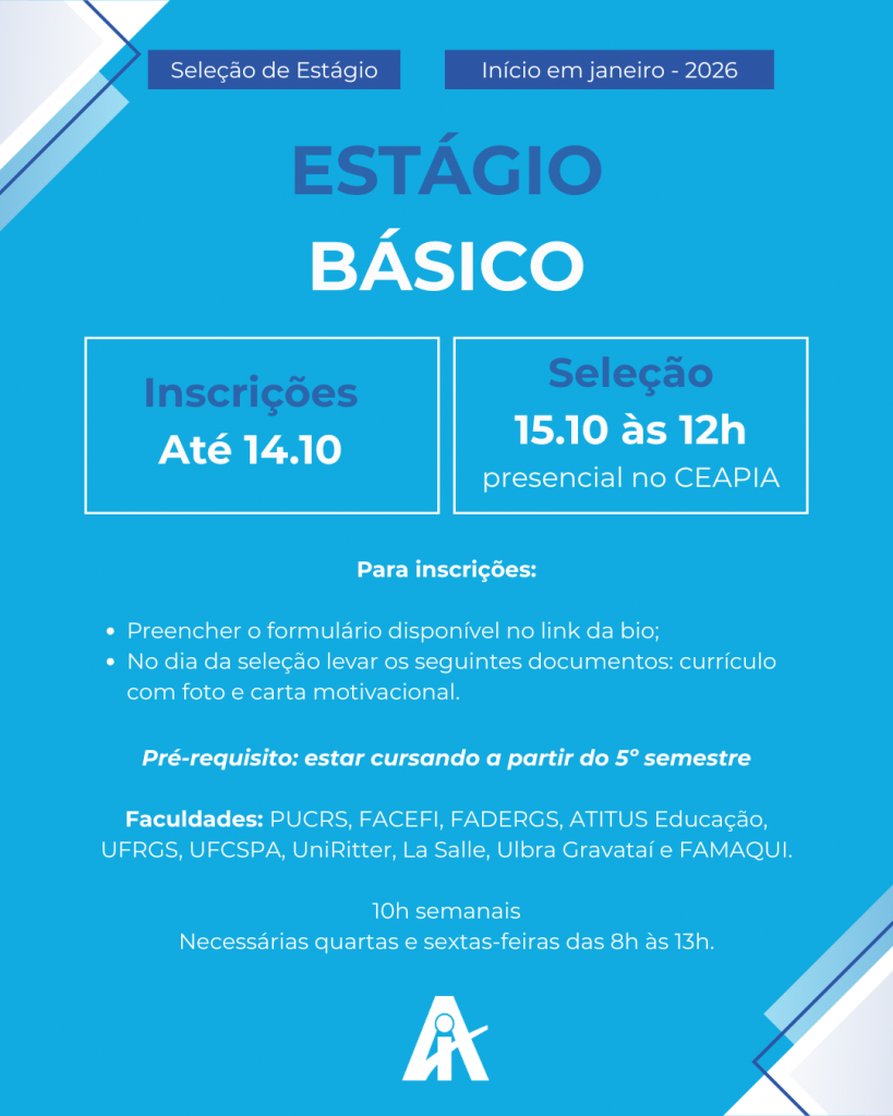 Inscrições: até 14/10 | Seleção: 15/10 (presencial) | Início do estágio: janeiro de 2026 O CEAPIA oferece uma oportunidade única para estudantes de Psicologia iniciarem sua formação prática em um espaço de referência. Esperamos por você! Inscreva-se: https://docs.google.com/forms/d/e/1FAIpQLSen0ev6Exop-9ZPSck61JRBGksMhZXIpoF4QFUGZH2P-g-cUw/viewform #CEAPIA #Psicologia #Estágio #Formação #Aprendizado