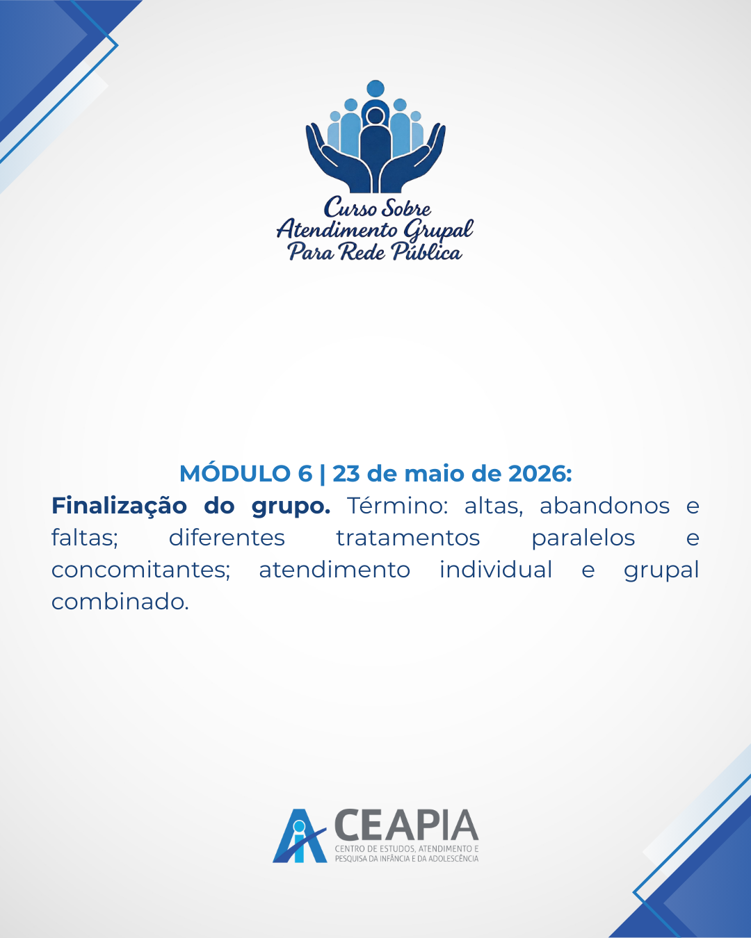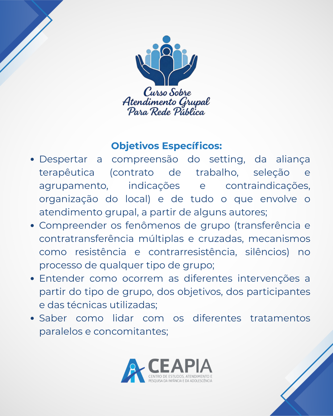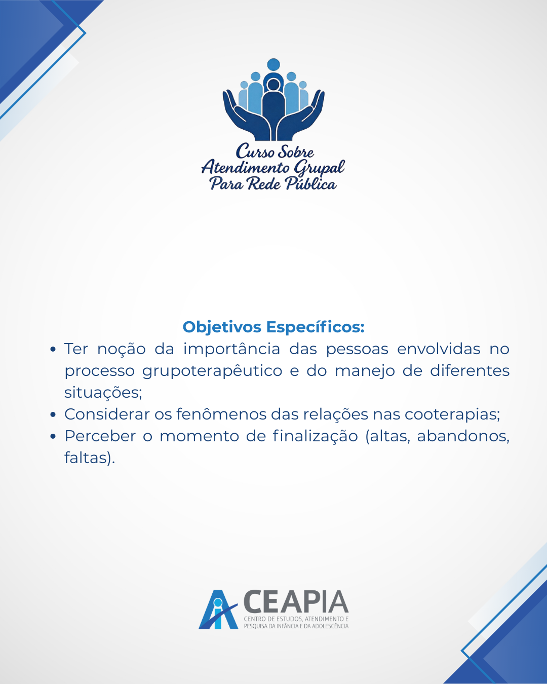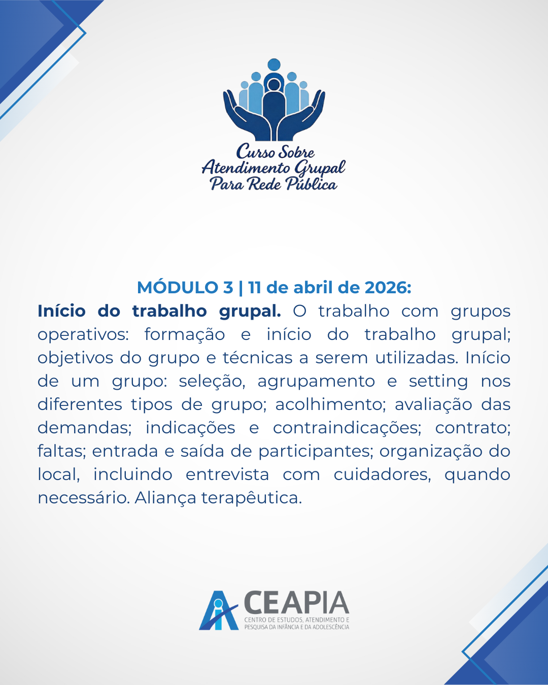 #CEAPIA #FormaçãoContinuada #AtendimentoGrupal #SaúdePública #Grupoterapia #Psicanálise #TrabalhoEmRede #FormaçãoClínica #Prefeituras #CuidadoColetivo