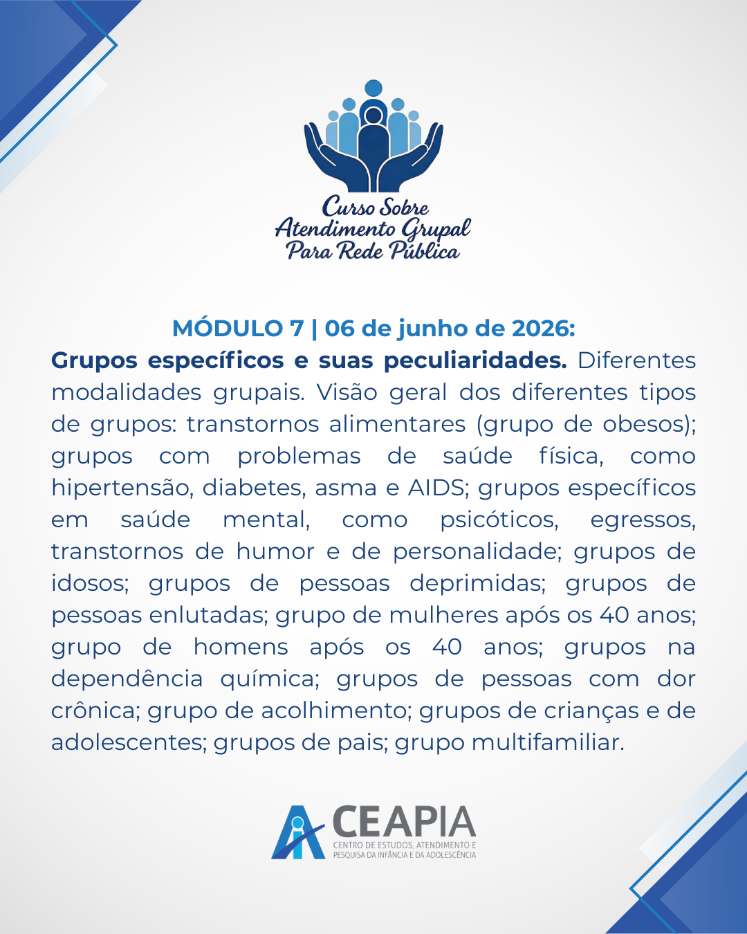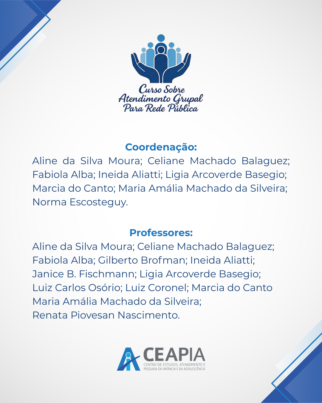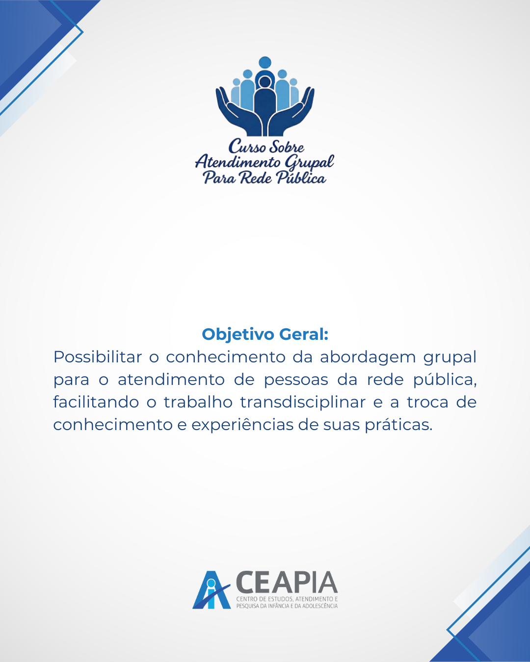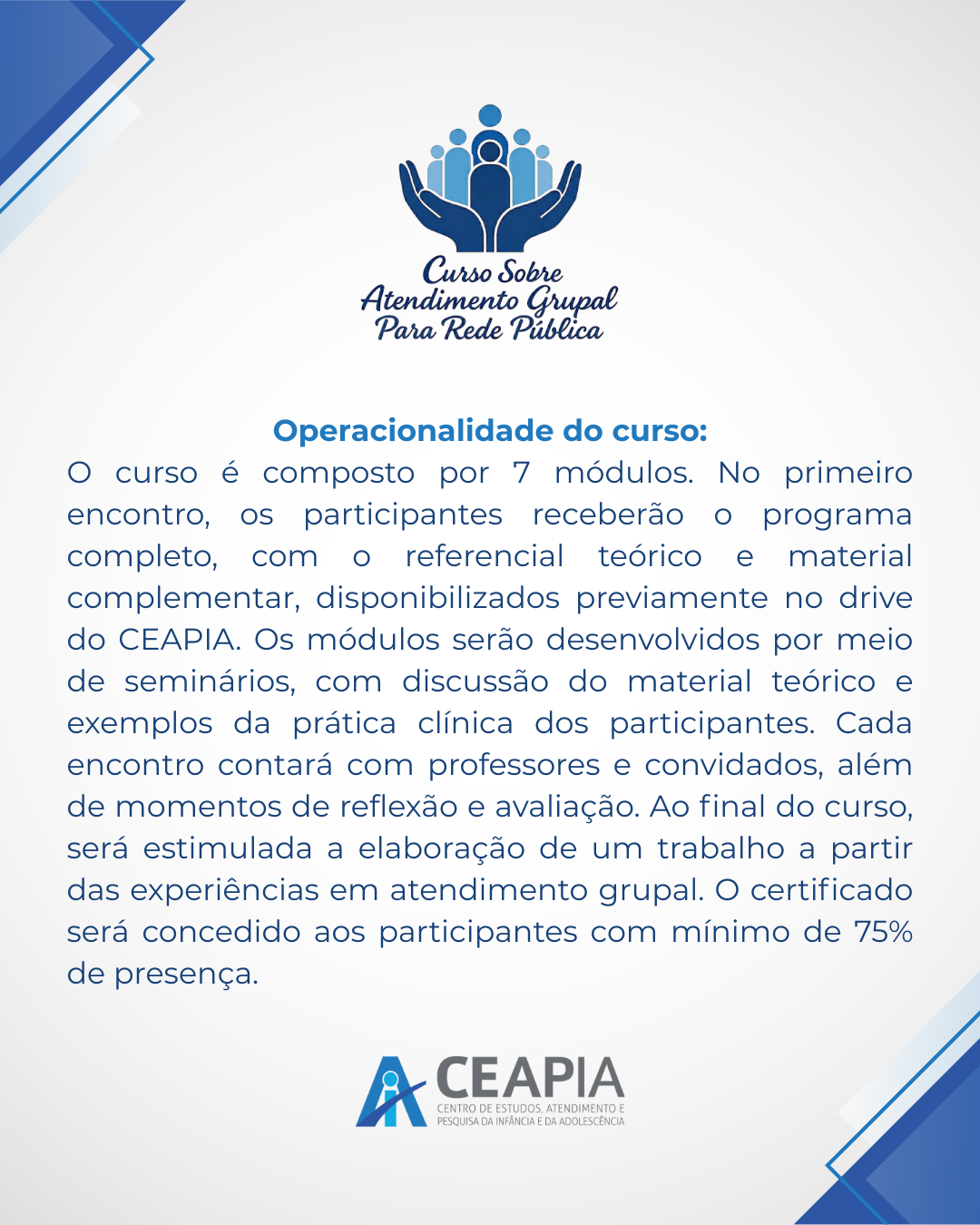 #CEAPIA #FormaçãoContinuada #AtendimentoGrupal #SaúdePública #Grupoterapia #Psicanálise #TrabalhoEmRede #FormaçãoClínica #Prefeituras #CuidadoColetivo