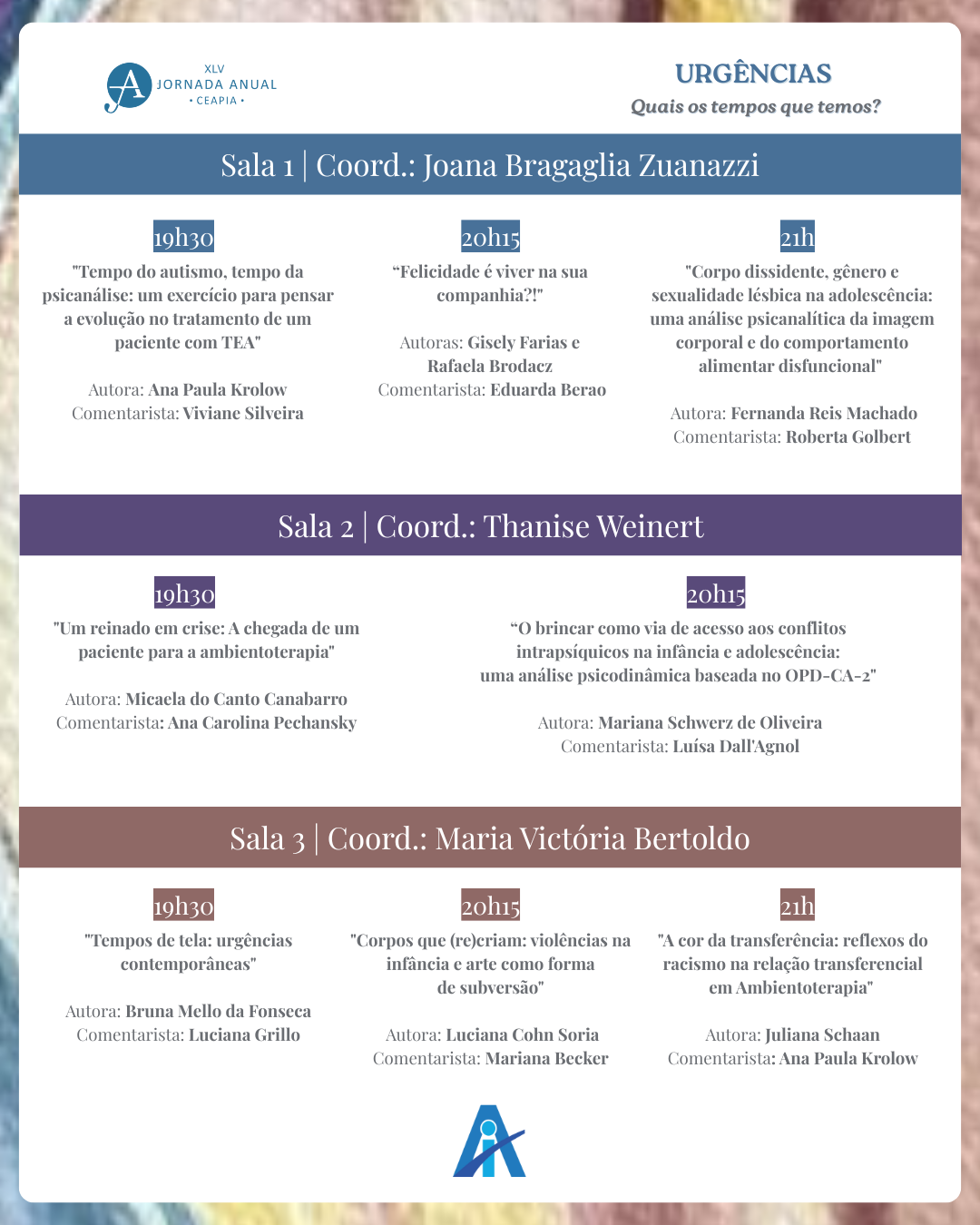 Preparamos uma programação rica e diversificada, com debates essenciais para a nossa prática clínica. Serão 3 salas simultâneas com discussões sobre autismo, adolescência, violências, racismo e muitos outros assuntos contemporâneos.