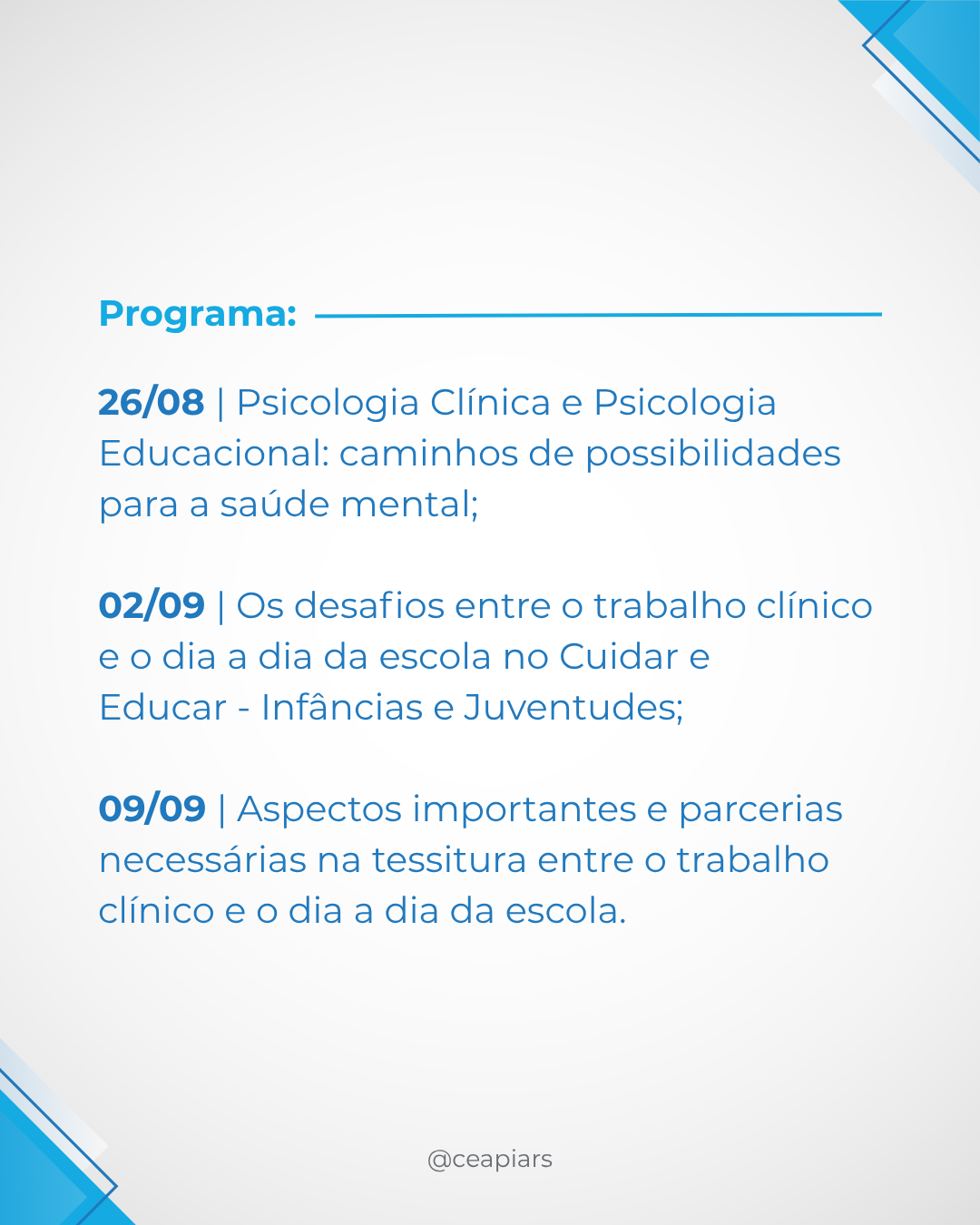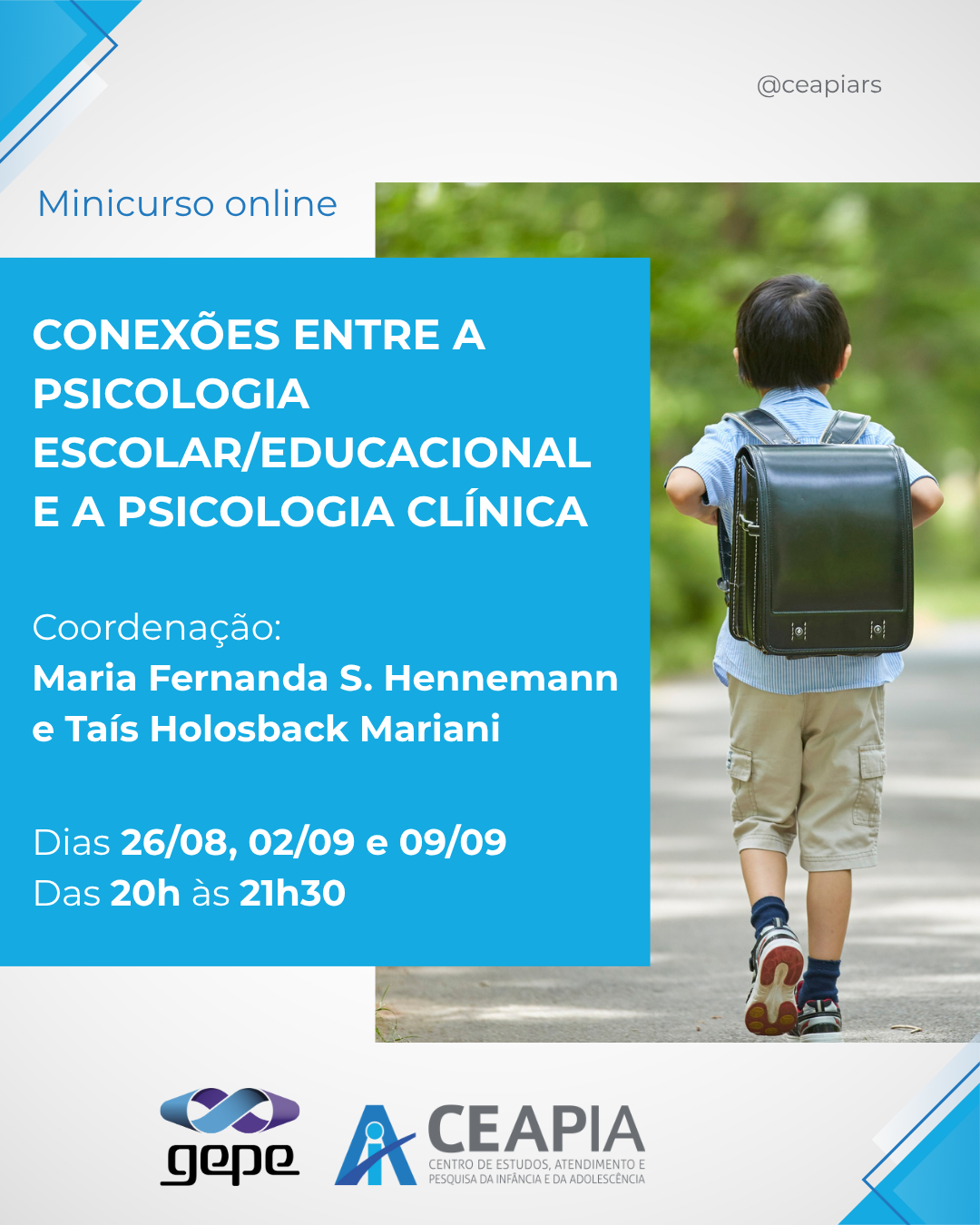 #CEAPIA #GEPE #PsicologiaEscolar #PsicologiaClinica #Psicologia #Educação #Formação