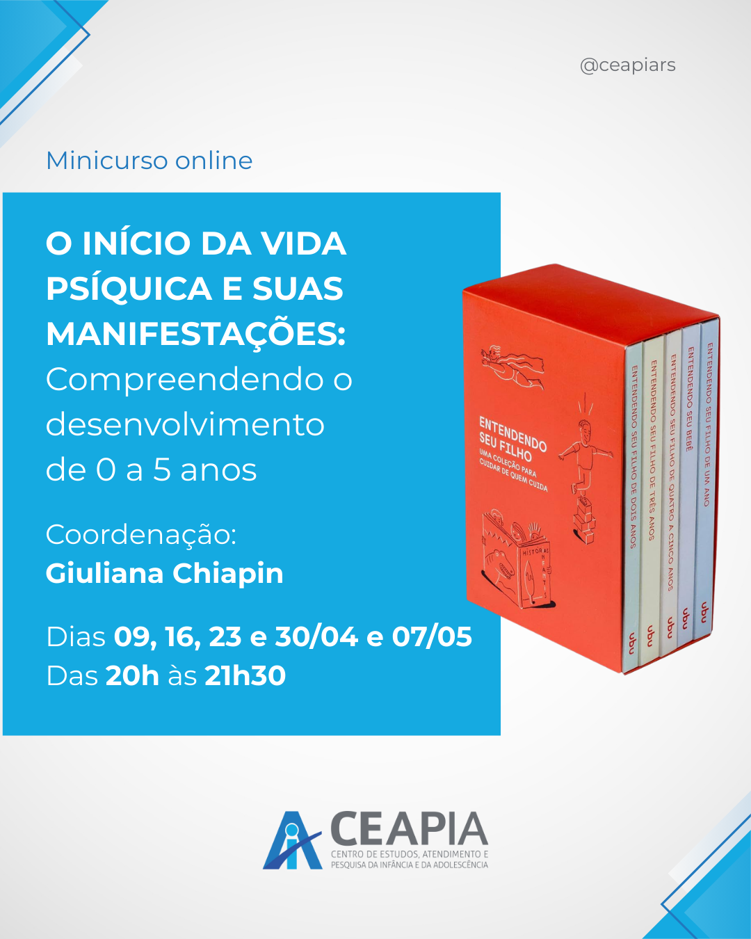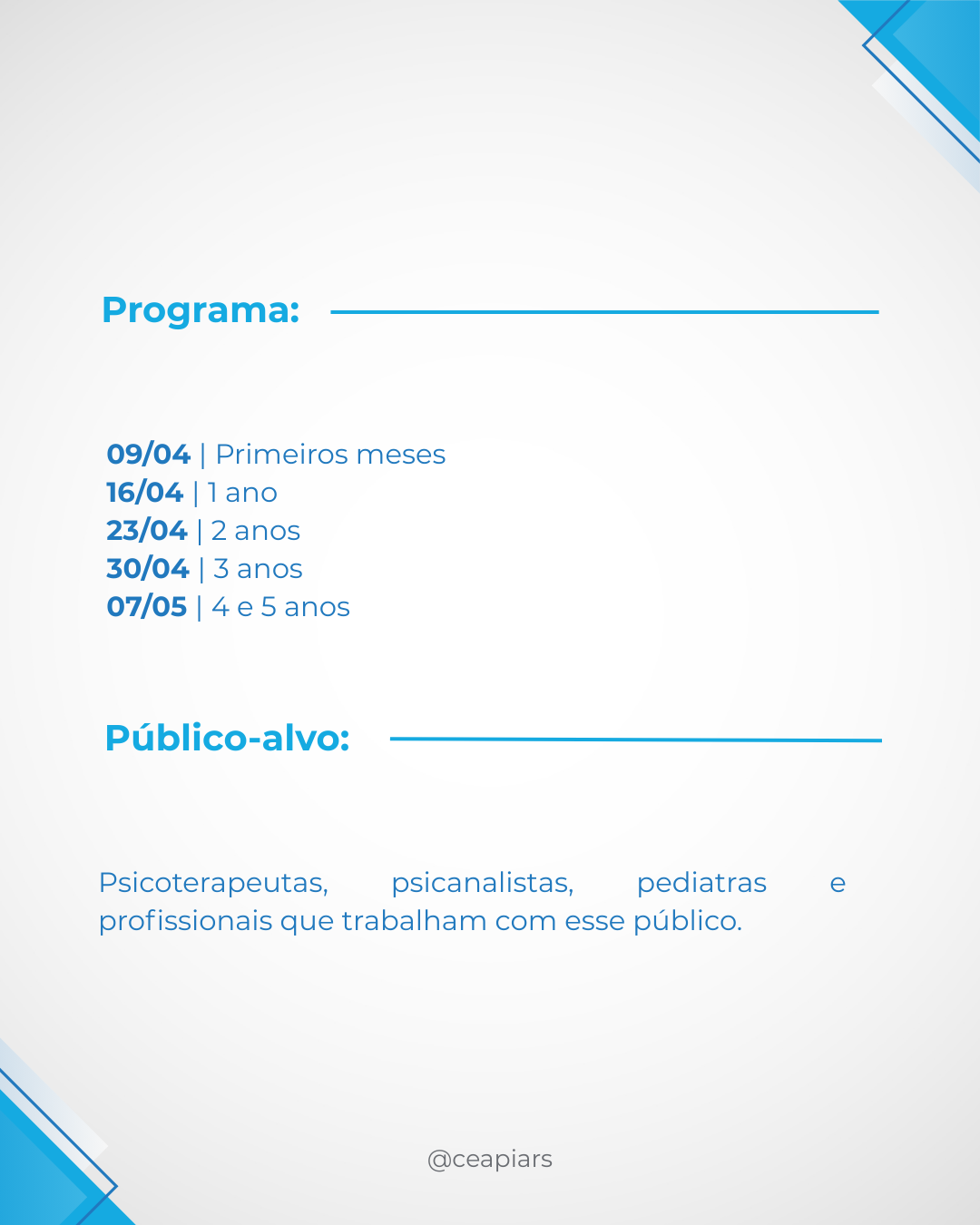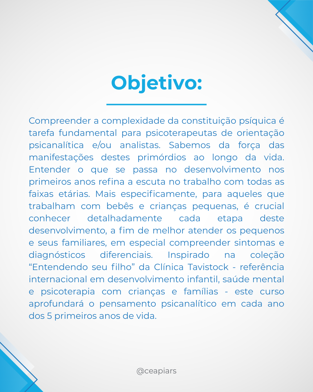 #CEAPIA #Psicanálise #DesenvolvimentoInfantil #PrimeiraInfância #Psicoterapia #Formação #SaúdeMental #Infância