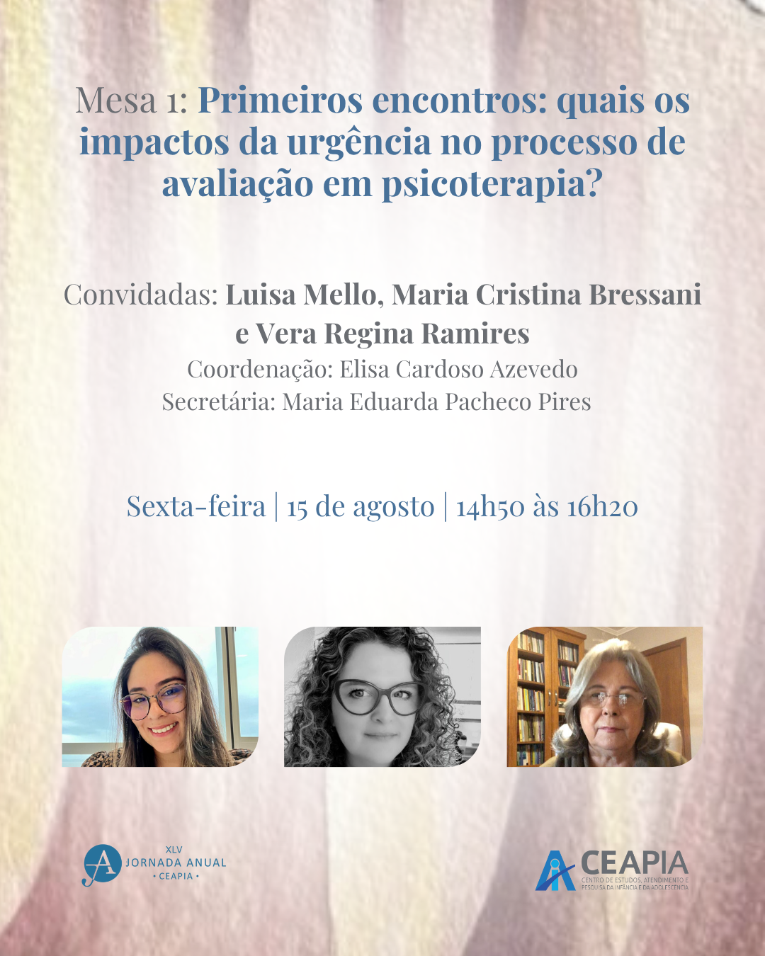 #XLVJornadaCEAPIA #Mesa1 #UrgênciaNaClínica #Psicoterapia #ProcessoDeAvaliação #Psicanálise #FormaçãoClínica #CEAPIA2025