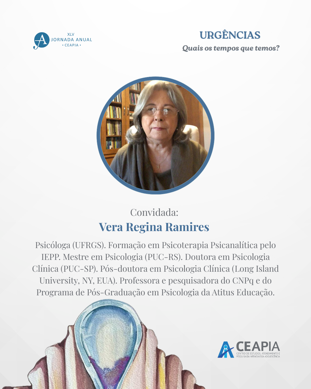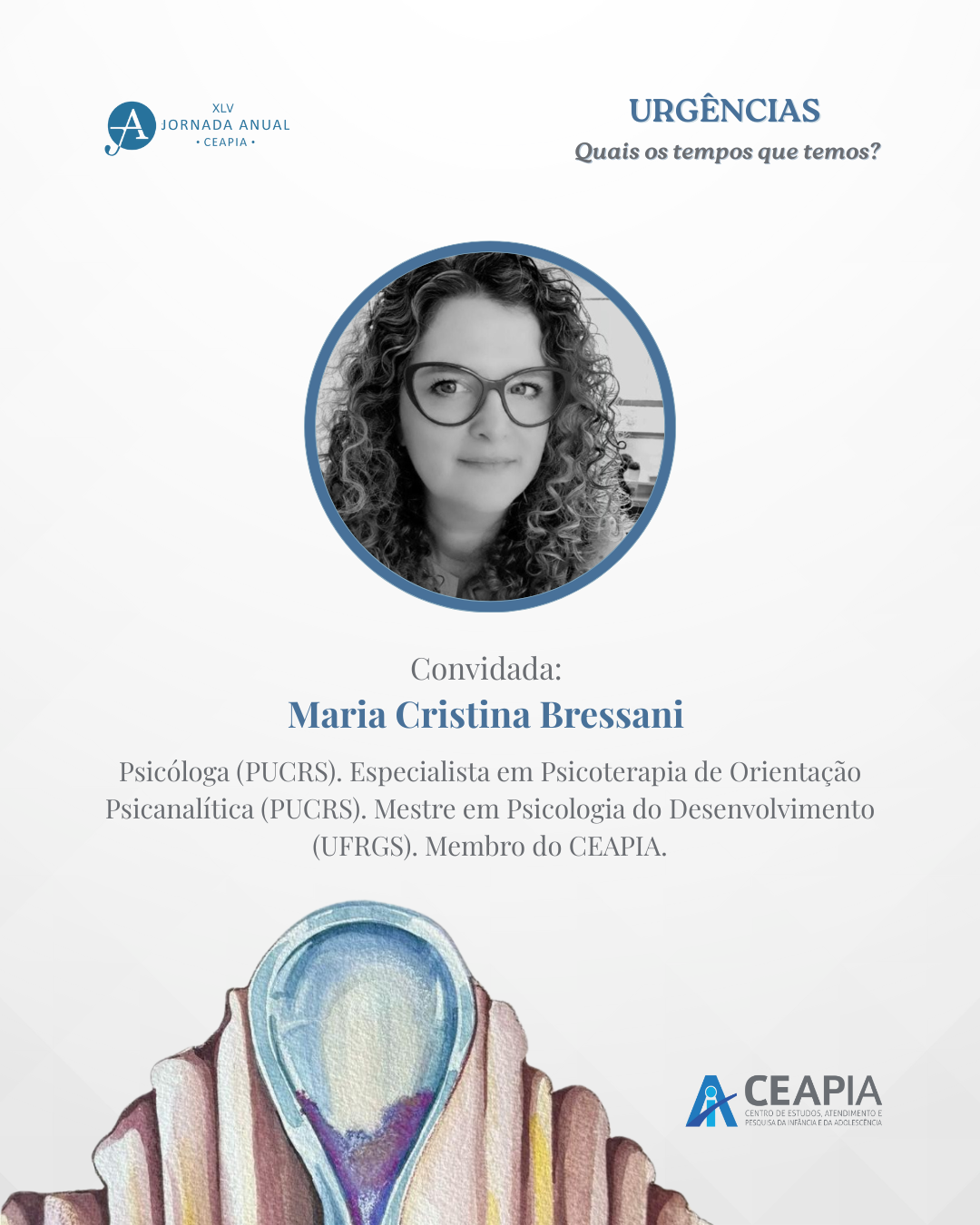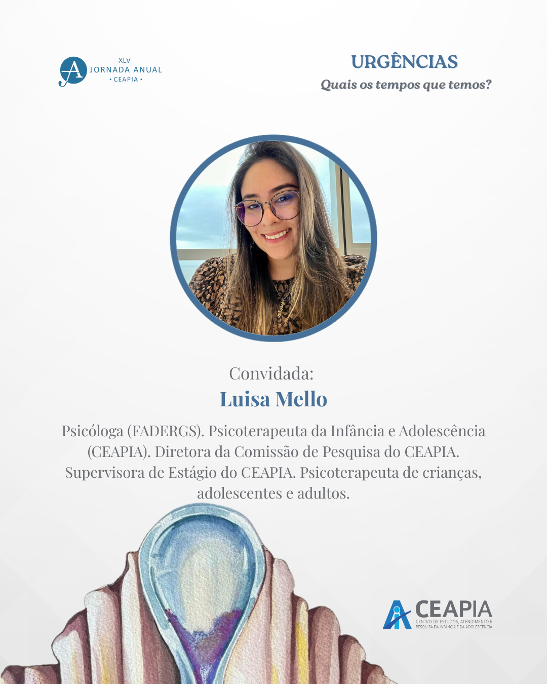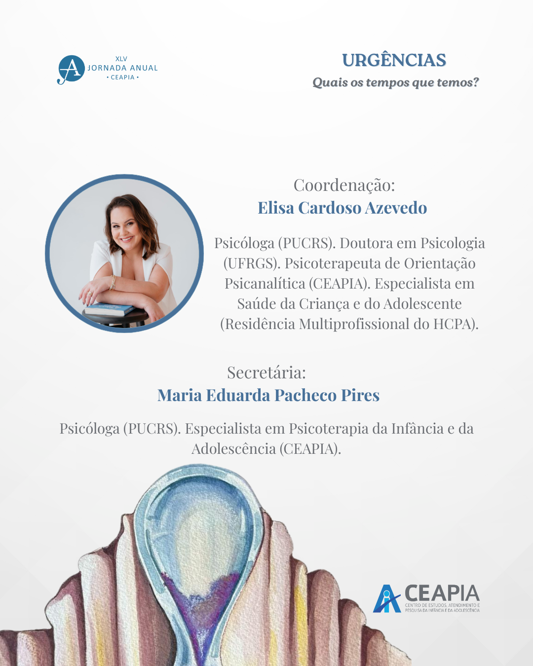 Na sexta-feira, dia 15 de agosto, das 14h50 às 16h20, acontece a Mesa 1 da XLV Jornada Anual do CEAPIA. Com o tema “Primeiros encontros: quais os impactos da urgência no processo de avaliação em psicoterapia?”, a proposta é refletir sobre como a urgência se manifesta nos atendimentos iniciais e de que maneira interfere na escuta, no vínculo e no percurso clínico.
