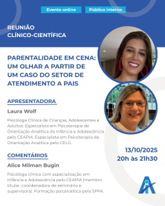 Convidamos todos para a próxima edição da Reunião Clínico-Científica, que será realizada no dia 13 de outubro de 2025, das 20h às 21h30, em formato online. O encontro terá como tema: “Parentalidade em cena: um olhar a partir de um caso do Setor de Atendimento a Pais”.